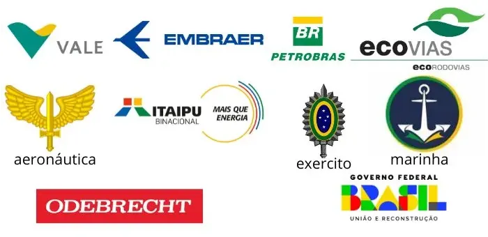 Entre eles estão: Vale, Embraer, Petrobras, Ecovias, Itaipu Binacional, Odebrecht, Forças Armadas (Aeronáutica, Exército e Marinha) e o Governo Federal do Brasil.